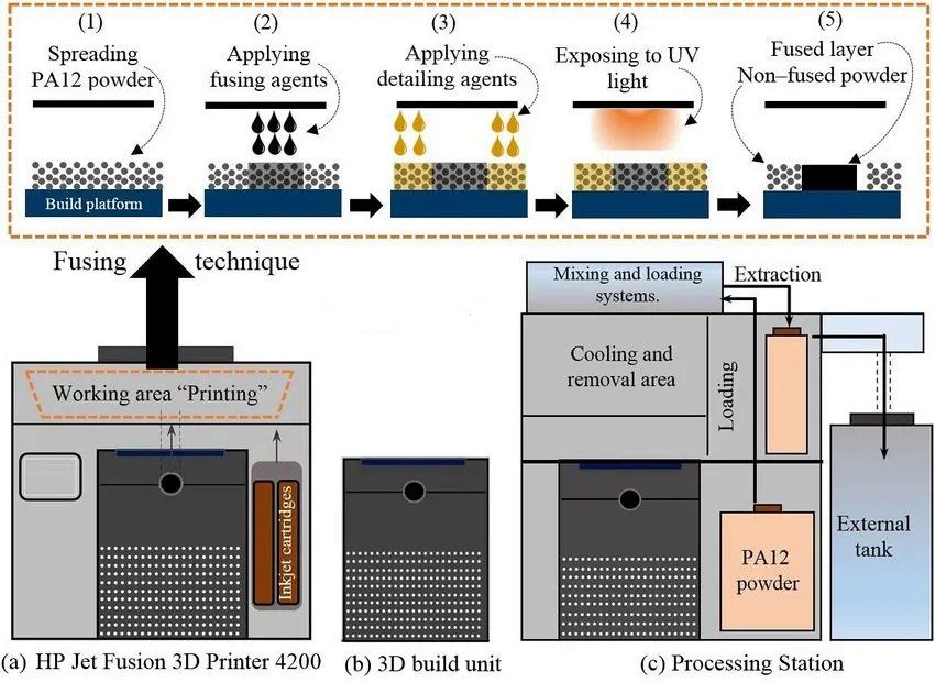 چاپ سه بعدی مولتی جت فیوژن (MJF) از چندین مرحله کلیدی برای تولید قطعات سهبعدی استفاده میکند. در ادامه به شرح این مراحل میپردازیم: